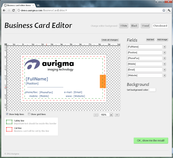 The business card editor uses HTML5 as underlying technology on client side, no need Flash, Java, and ActiveX. Just open a browser and design your business card. The solution supports all major Web browsers and works very fast, it can be integrated with any ASP.NET Web Application. You can play with the solution on our demo Web site – business card editor software. If you are interested in this solution, don't hesitate to contact our team at info@aurigma.com.