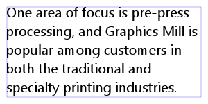 var content = @"One area of focus is pre-press processing, and Graphics Mill is popular among customers in both the traditional and specialty printing industries.";