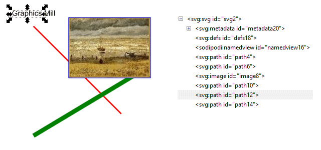 Now, open the out.svg file in an editor, in Inkscape for example, and verify that the file contains path elements for text objects and graphical primitives, and an image element for raster images.
