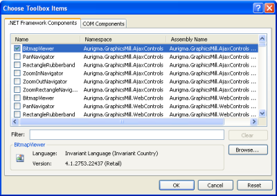 If you cannot find this component, click Browse... and find the Aurigma.GraphicsMill.AjaxControls.dll assembly. Then click OK on both Open and Choose Toolbox Items dialogs.