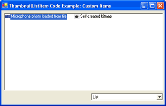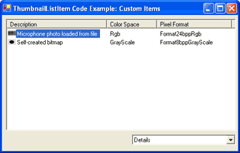 The usage of this class is very similar to the one of ThumbnailListItem. Here is how items are added to the control and how the columns are configured for the detals list.