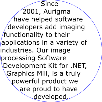 text.String = "Since 2001, Aurigma have helped software developers add imaging functionality to their applications in a variety of industries. Our image processing Software Development Kit for .NET, Graphics Mill, is a truly powerful product we are proud to have developed.";